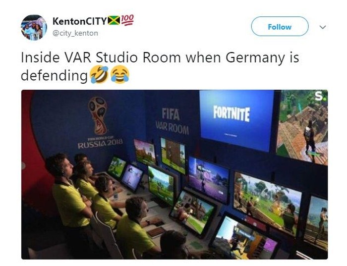 Tapi, banyak yang bilang Jerman diuntungkan karena VAR yang dipakai malah digunakan main Fortnite saat pemain Swedia dilanggar. Foto: Meme/Twitter