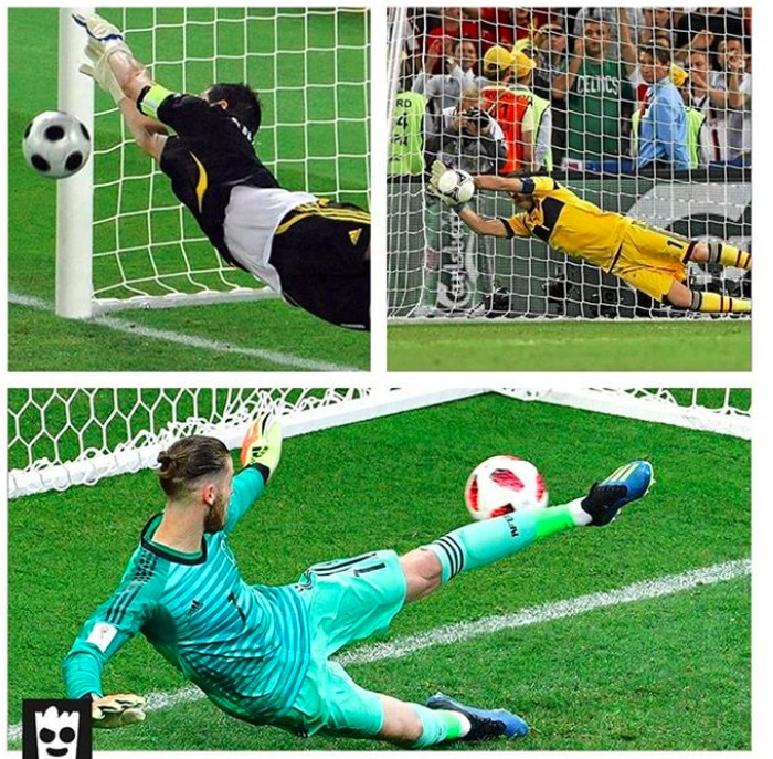 Penampilan Iker Casillas di atas yang membuat banyak penyelamatan kala dulu membela Spanyol terlihat kontras dengan De Gea yang banyak kebobolan. Foto: istimewa