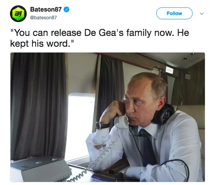 Ada yang menggambarkan bahwa Vladimir Putin menculik keluarga De Gea sehingga ia tampil memble lawan Rusia. Foto: istimewa