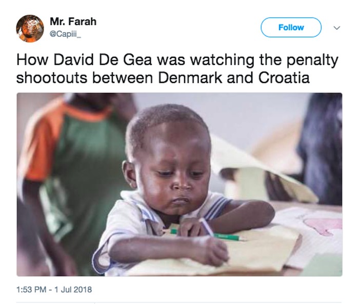 Gagal menyelamatkan satupun penalti, De Gea digambarkan belajar melihat kiper Denmark dan Kroasia menghadang penalti. Foto: istimewa