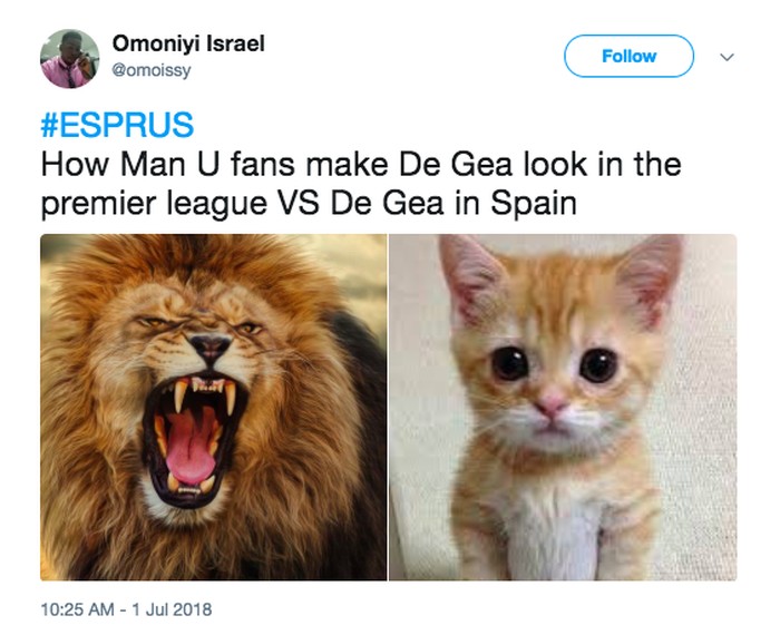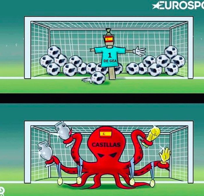 De Gea diilustrasikan kebobolan banyak gol dan seperti orang-orangan sawah. Sedangkan Casillas digambarkan perkasa saat membela Spanyol. Foto: istimewa