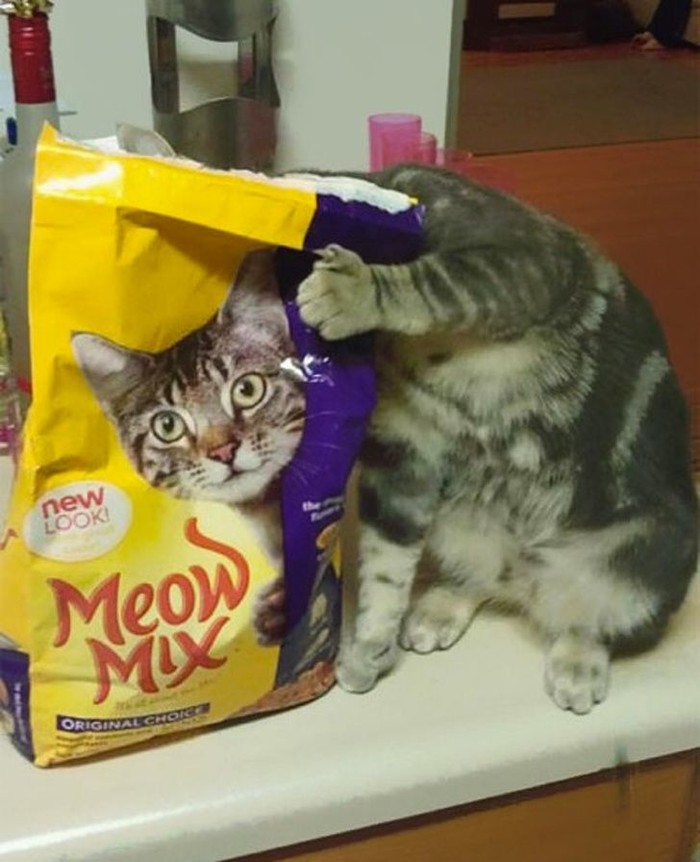 Perpaduan yang tepat kucing nyata dengan kemasan makanan. (Foto: Brightside)