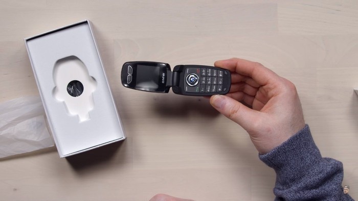 Tapi sebenarnya ini adalah flip phone buatan vendor bernama MiNi. Foto: YouTube/UnboxTherapy