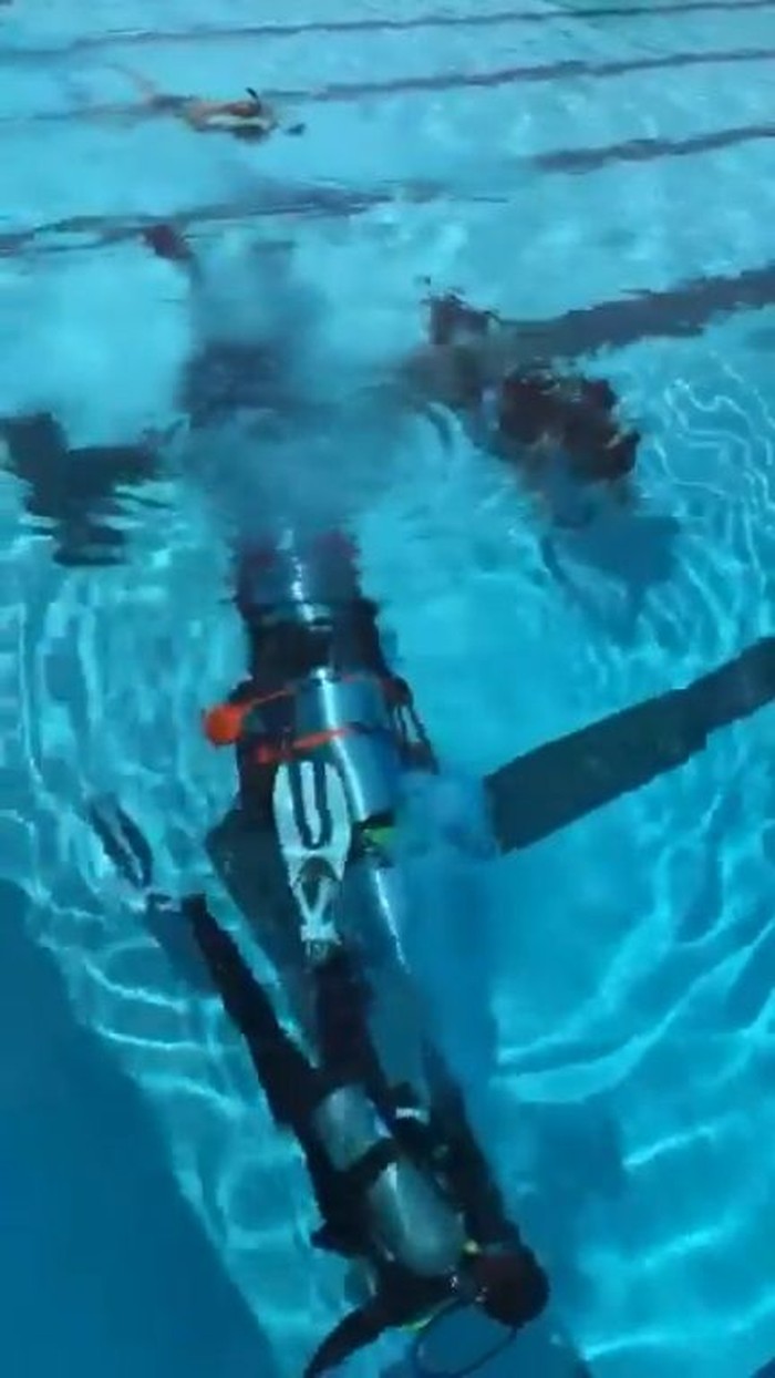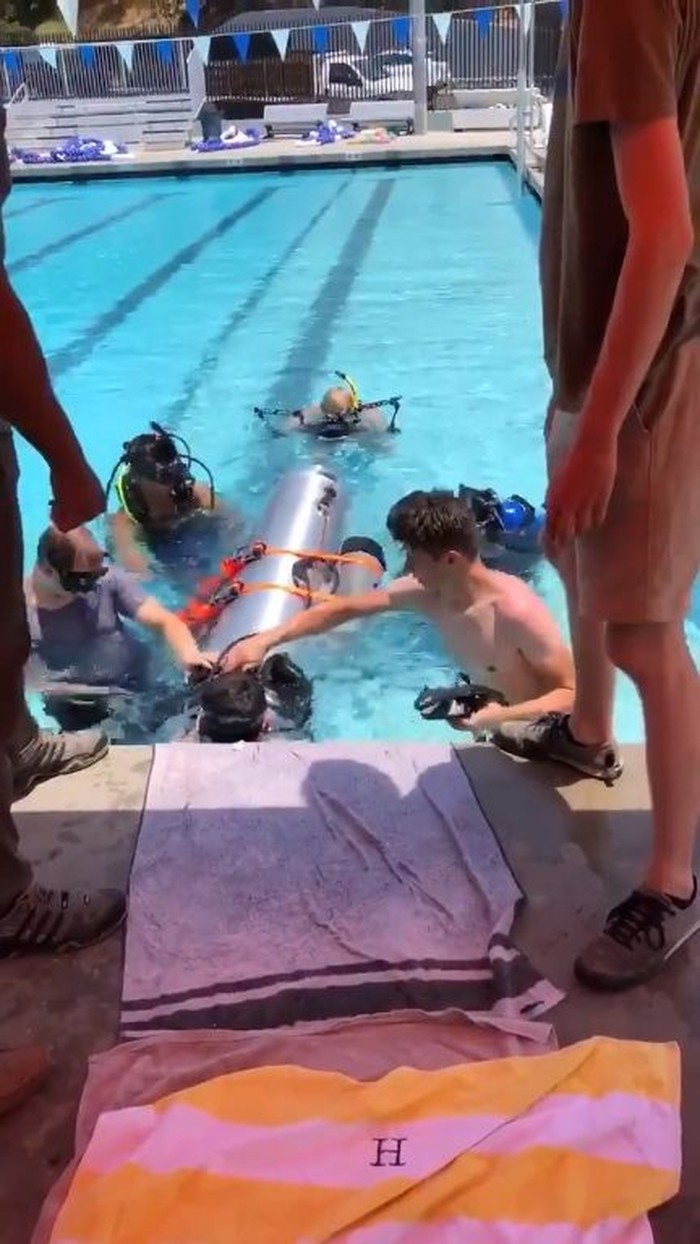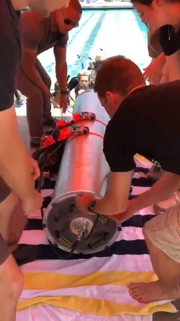 Sejumlah penyelam ditugaskan untuk membawa kapal selam mini berbobot sekitar di dalam kolam renang. Foto: Twitter/ElonMusk
