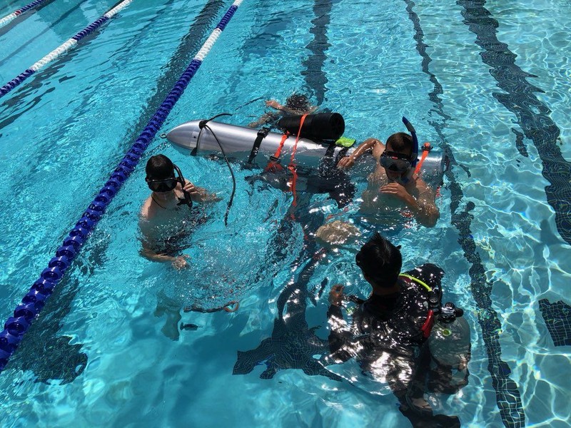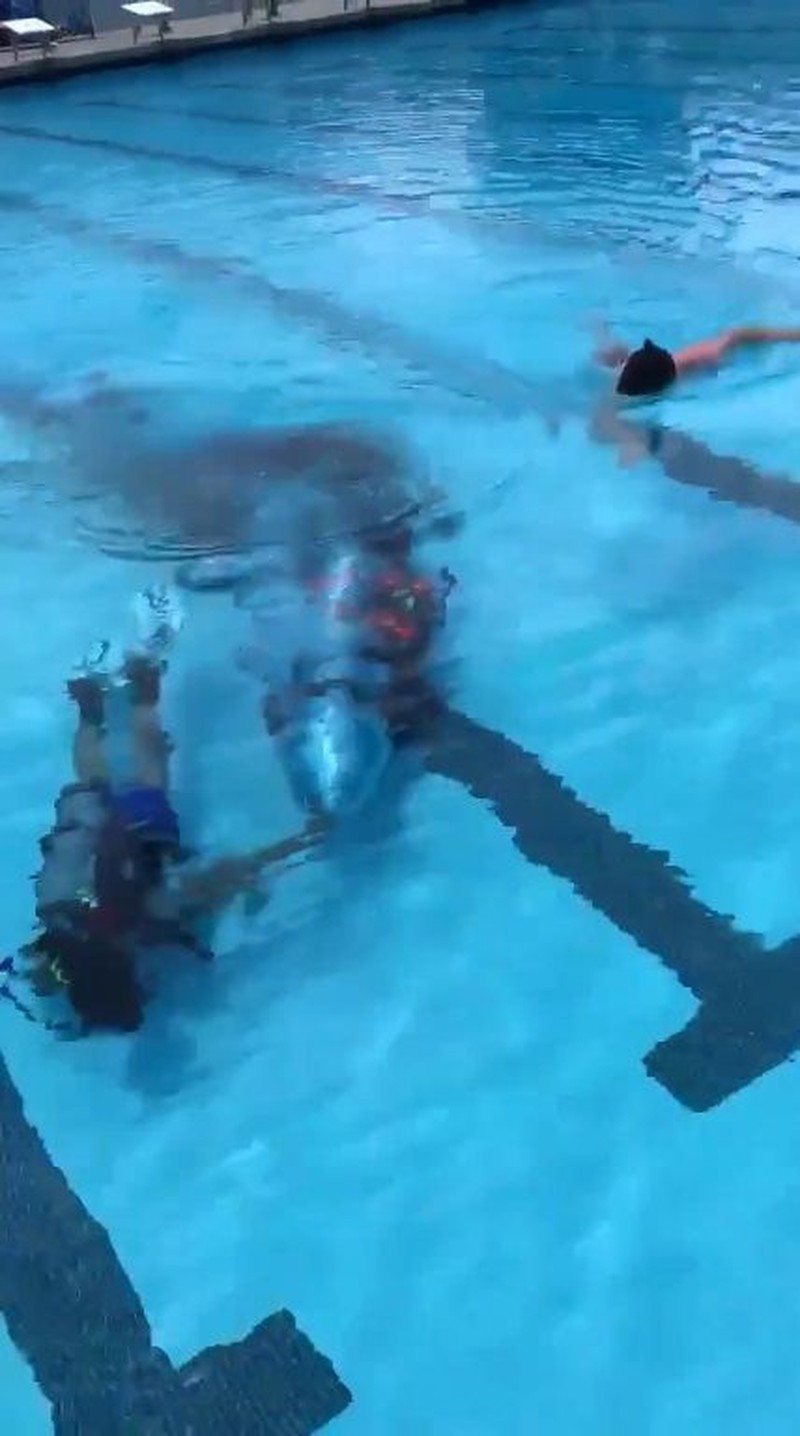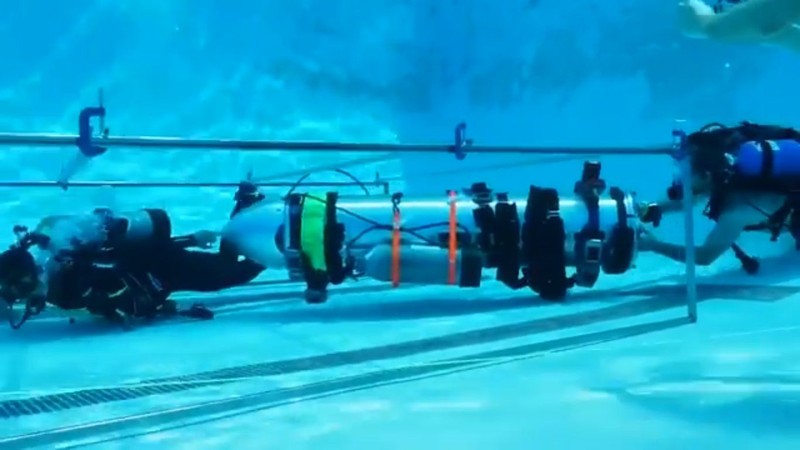 Sejumlah penyelam ditugaskan untuk membawa kapal selam mini berbobot sekitar di dalam kolam renang. Foto: Twitter/ElonMusk