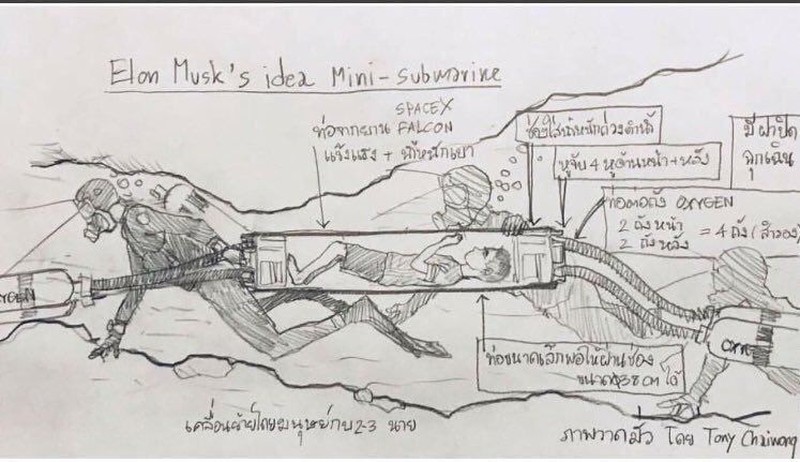 Sketsa yang menggambarkan rancangan awal dari kapal selam mini yang dijadwalkan dapat sampai Thailand malam ini. Foto: Twitter/dcliem