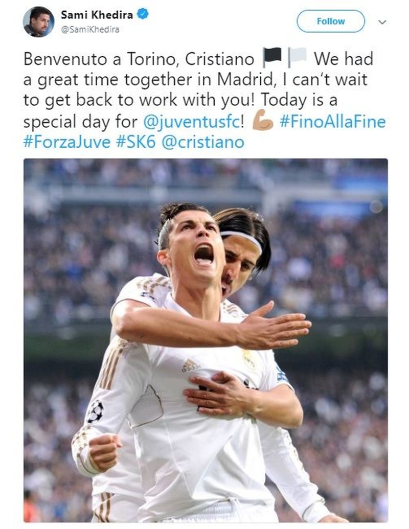 Di sisi lain, Sami Khedira yang merupakan mantan pemain Real Madrid memberikan ucapan selamat datang kepada Ronaldo. Foto: Istimewa/Twitter
