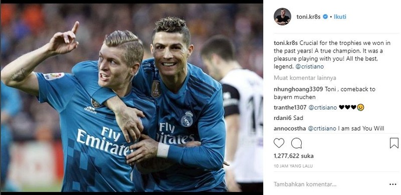 Lewat akun Instagram miliknya, Toni Kroos mendoakan yang terbaik untuk Ronaldo ke depannya. Foto: Istimewa