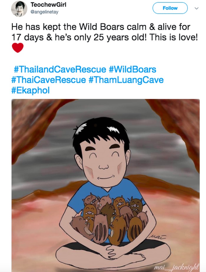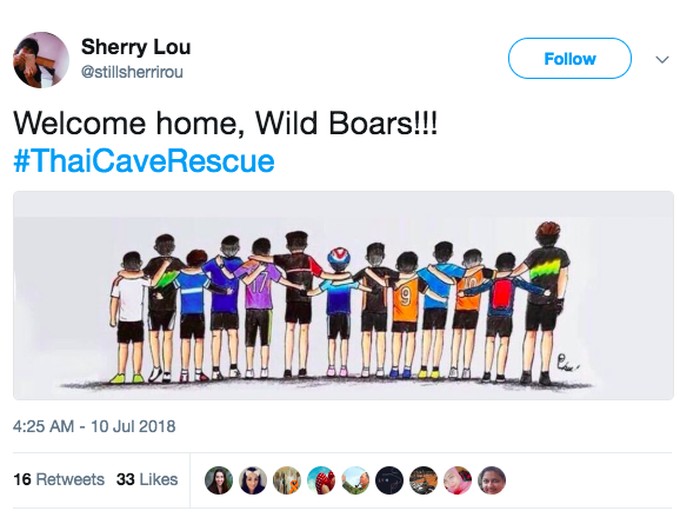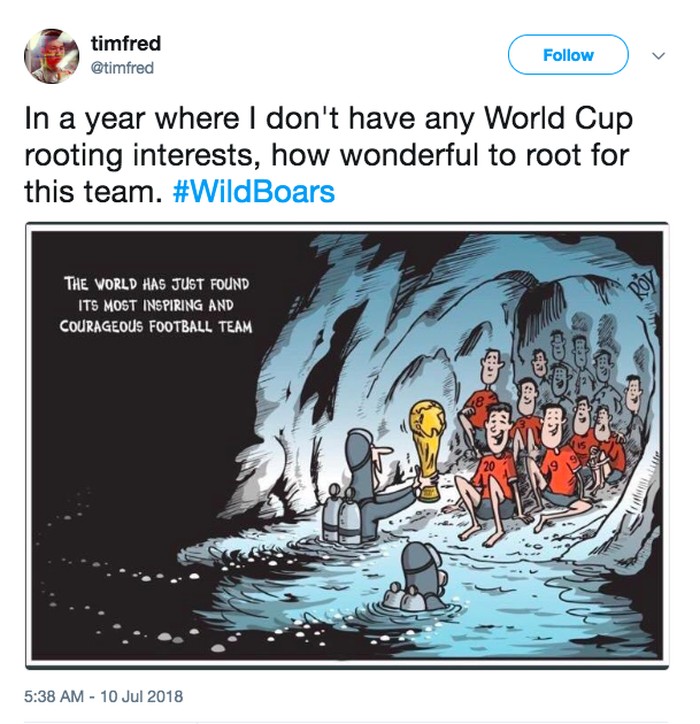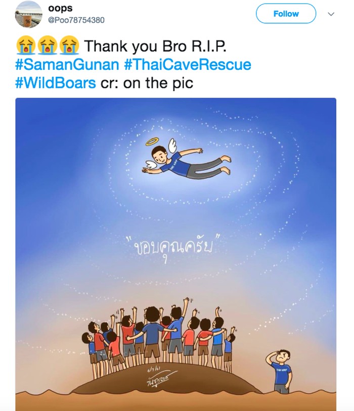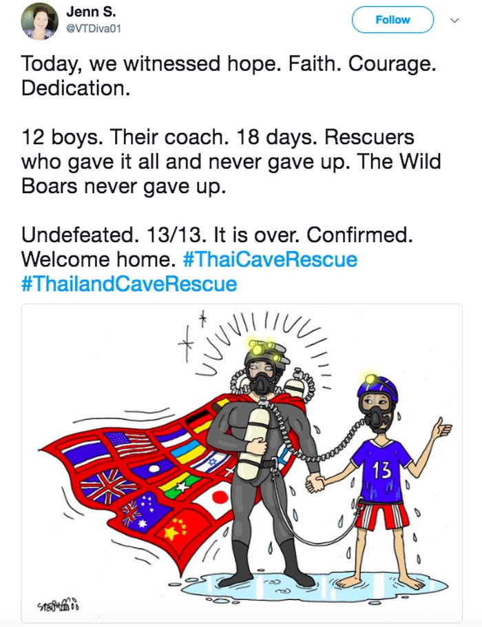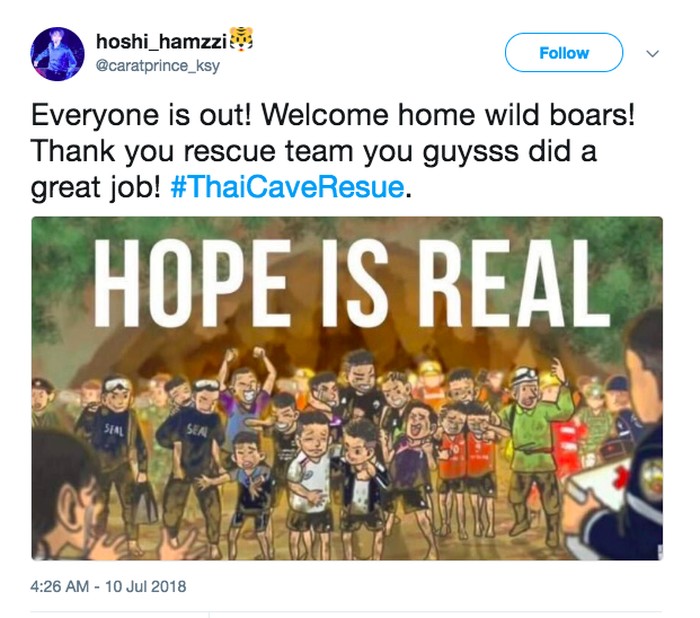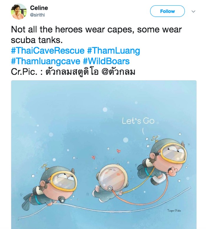 "Para penyelamat yang memberikan segalanya dan tak pernah menyerah. Wild Boars juga tak pernah menyerah Sudah selesai, selamat pulang ke rumah," tulis netizen ini dengan kartun yang menggambarkan seorang penyelamat bersama anak yang dibawanya. Foto: istimewa