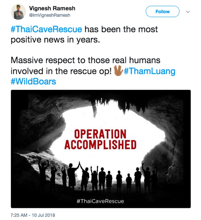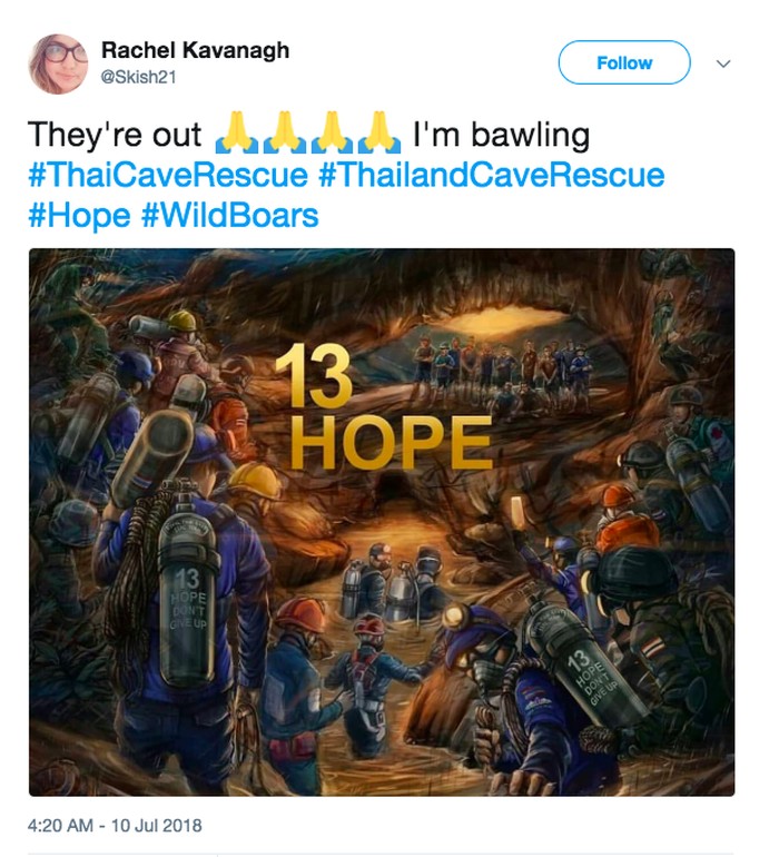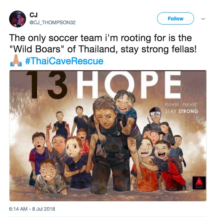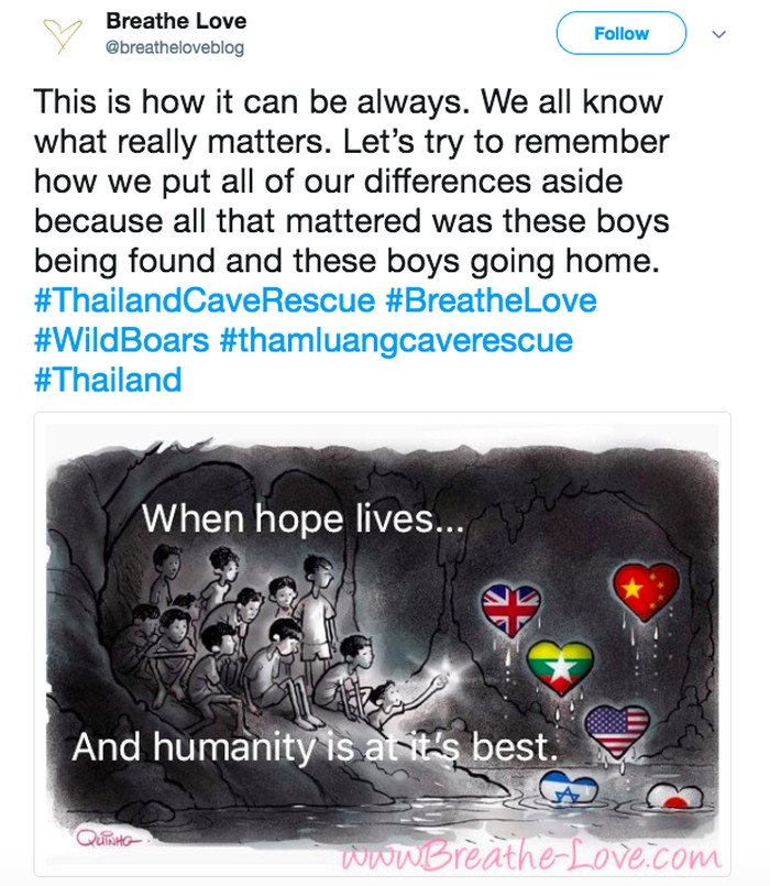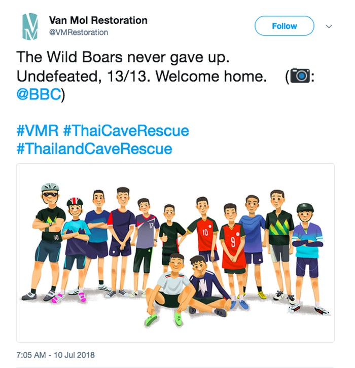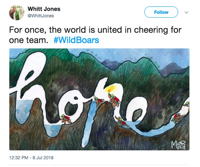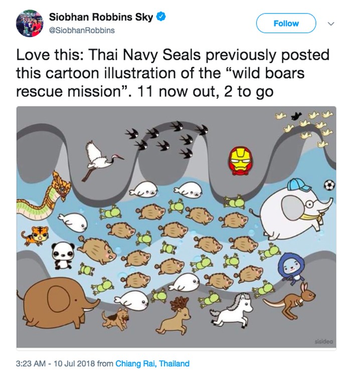 "Para penyelamat yang memberikan segalanya dan tak pernah menyerah. Wild Boars juga tak pernah menyerah Sudah selesai, selamat pulang ke rumah," tulis netizen ini dengan kartun yang menggambarkan seorang penyelamat bersama anak yang dibawanya. Foto: istimewa