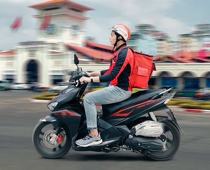 Penampakan driver Go-Viet dengan motornya dan tas untuk membawa barang yang akan dikirim. Foto: istimewa
