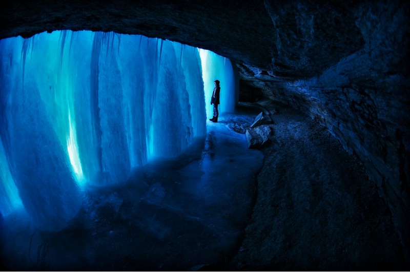 Air terjun Minnehaha di Minnesota memiliki gua sementara yang hanya ada pada musim dingin. Ia bersembunyi di balik air terjun yang membeku. Foto: Matador Network