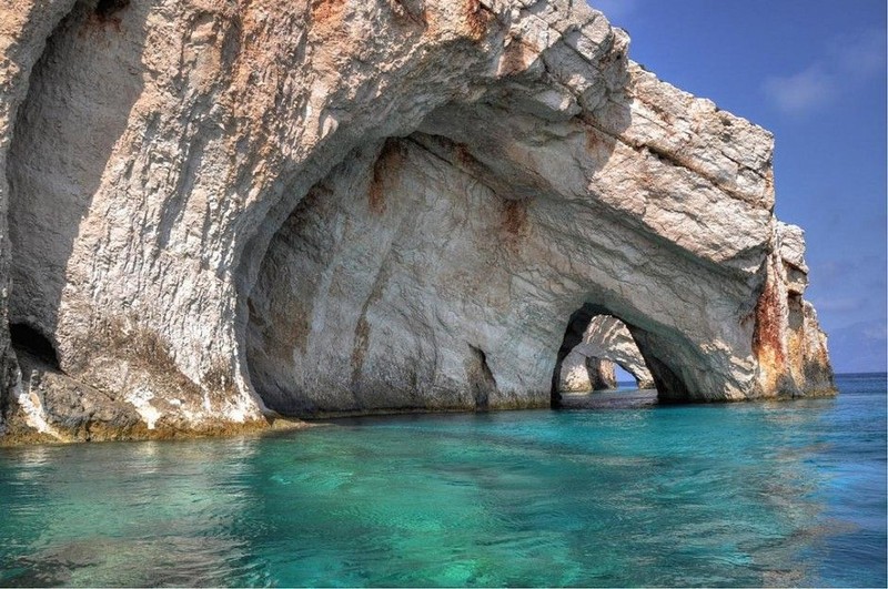 Gua Zakynthos di Yunani dapat dikunjungi dengan menggunakan sampan. Di alamnya, tembok berwarna putih yang memantulkan warna air memberikan gua ini nuansa biru yang kental. Foto: Matador Network