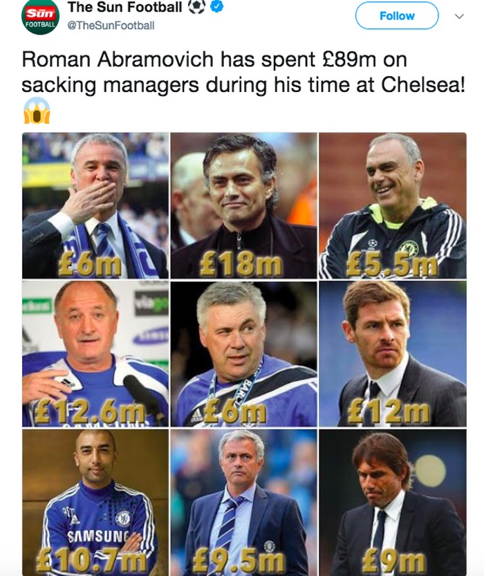 Banyaknya pelatih yang dipecat Roman membuatnya harus menghabiskan biaya kompensasi yang tidak sedikit. Foto: istimewa