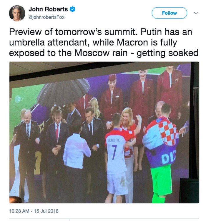 Vladimir Putin memakai payung sendirian saat penyerahan trofi Piala Dunia, sedangkan presiden Prancis dan Kroasia dibiarkan kehujanan. Netizen pun bergunjing.