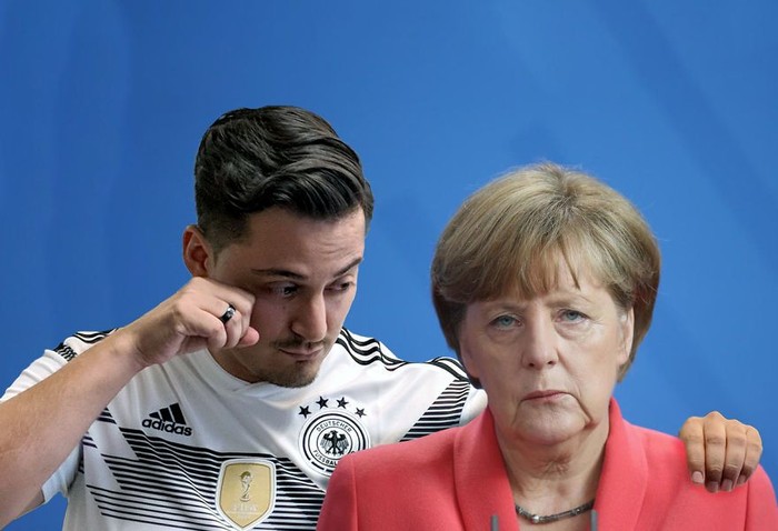 Kekalahan tim sepakbola Jerman menjadi juara membuat Jones harus menghibur Kanselir Jerman Angela Merkel yang terlihat sedih. Istimewa/Boredpanda.