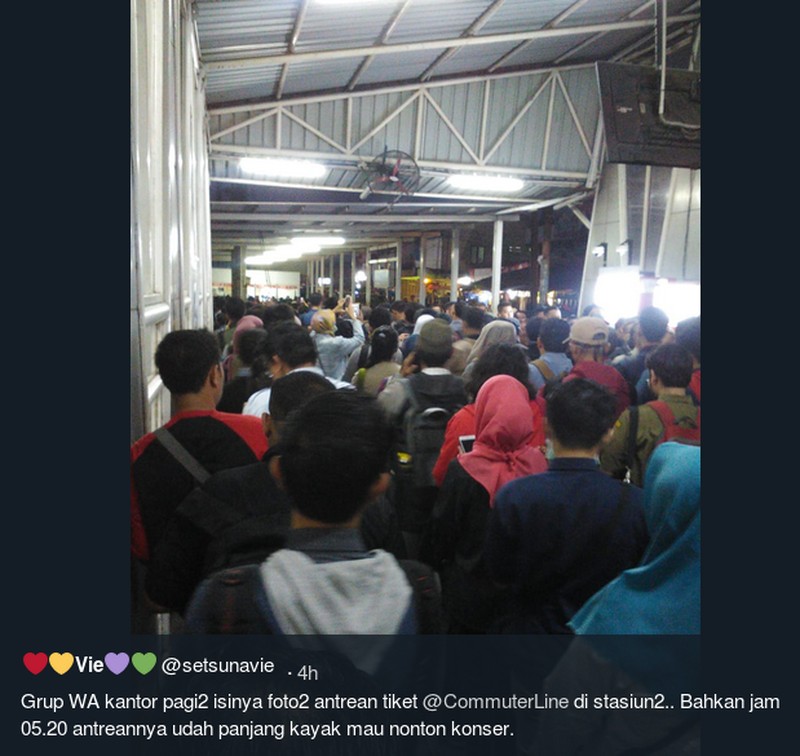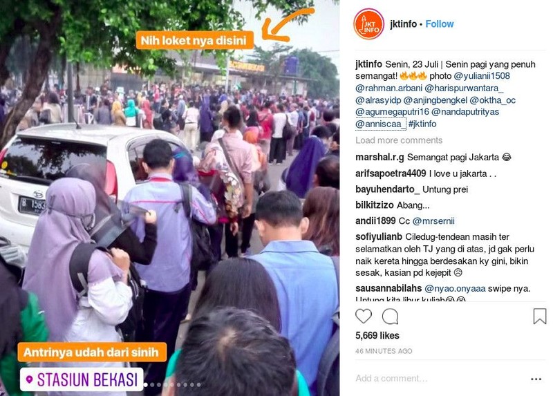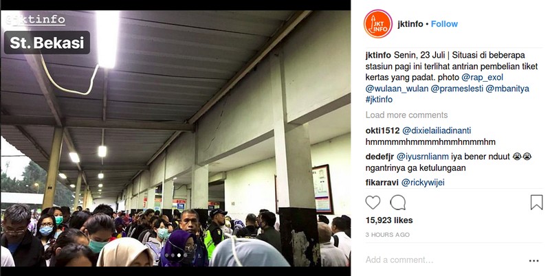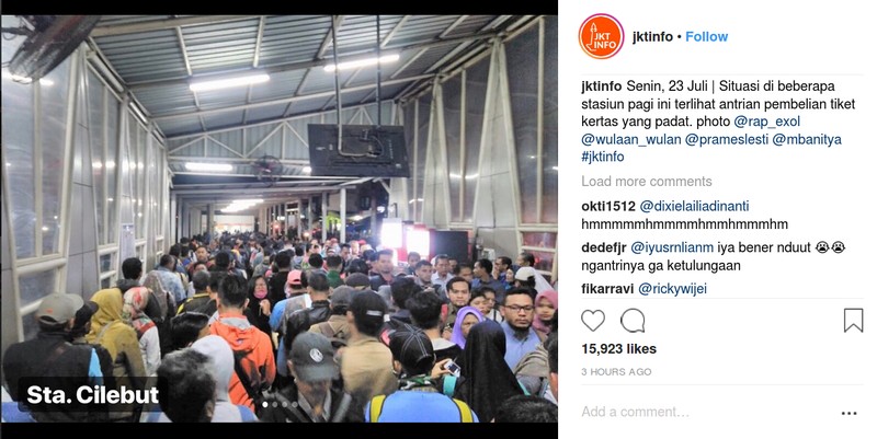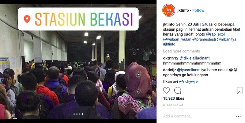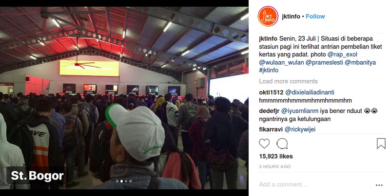 Alhasil, linimasa media sosial dan grup-grup WhatsApp hari ini dipenuhi laporan antrean tiket. Foto: Instagram @jktinfo