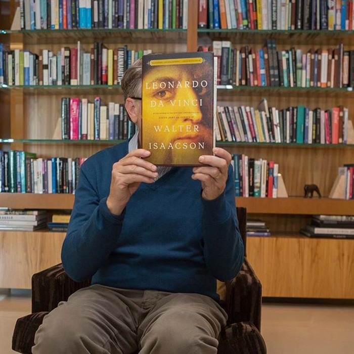 Gates justru melakukan selfie #bookface menggunakan buku biografi Leonardo da Vinci karya Walter Isaacson. Foto: Instagram