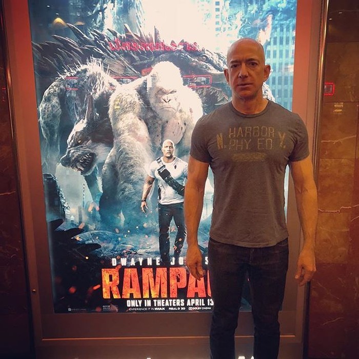 Bezos juga sering menaruh caption kocak di foto yang ia unggah. Seperti saat berfoto di depan poster film Rampage dan ia menaruh caption 'masih mengerjakan tatapan tajam saya'. Foto: Instagram