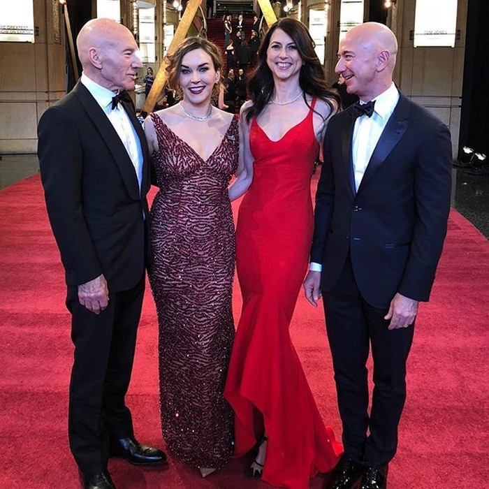 Bezos sering menghadiri acara glamor yang juga dihadiri oleh selebriti papan atas. Seperti saat ia bertemu aktor pemeran Kapten Picard dan Professor X, Patrick Stewart. Foto: Instagram