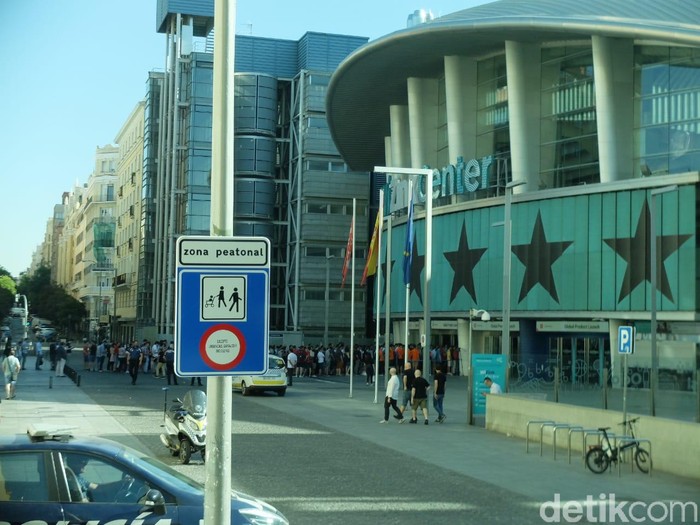Mereka tertib menunggu giliran masuk di bawah sinar matahari Spanyol yang cerah. Foto: Dhani Irawan/detikcom