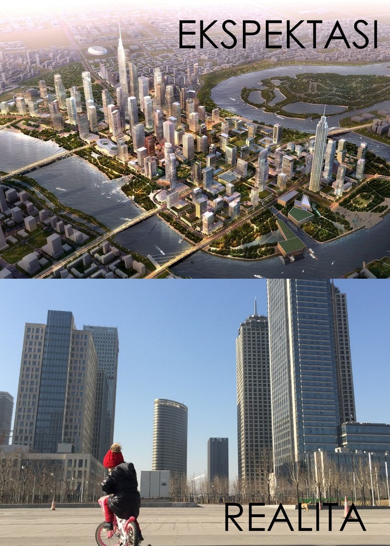 Yujiapu di China: sebuah distrik bisnis di China yang terinspirasi dari lingkungan di Manhattan. Distrik ini mulai dibangun pada tahun 2009 dengan dana yang dibutuhkan sebesar USD 30 miliar. Sayangnya, di tahun 2018, bangunan tersebut terlihat seperti ditinggalkan. Meskipun kereta kecepatan tinggi telah dibangun di Tianjin, namun ternyata tak mendukung pertumbuhan bisnis di daerah Yujiapu. (Foto: Businessinsider)