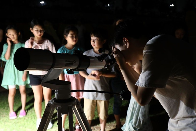 Anak-anak di Korea Selatan bergiliran menyaksikan proses gerhana Bulan. Foto: Getty Images