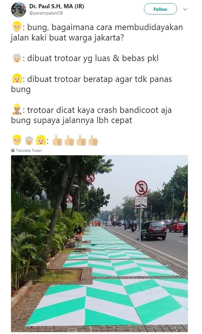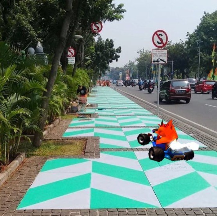 Trotoar di kawasan Jalan Medan Merdeka yang baru saja dicat disebut mirip dengan trek pada game Crash Bandicoot. Foto: Twitter/perempatanOB