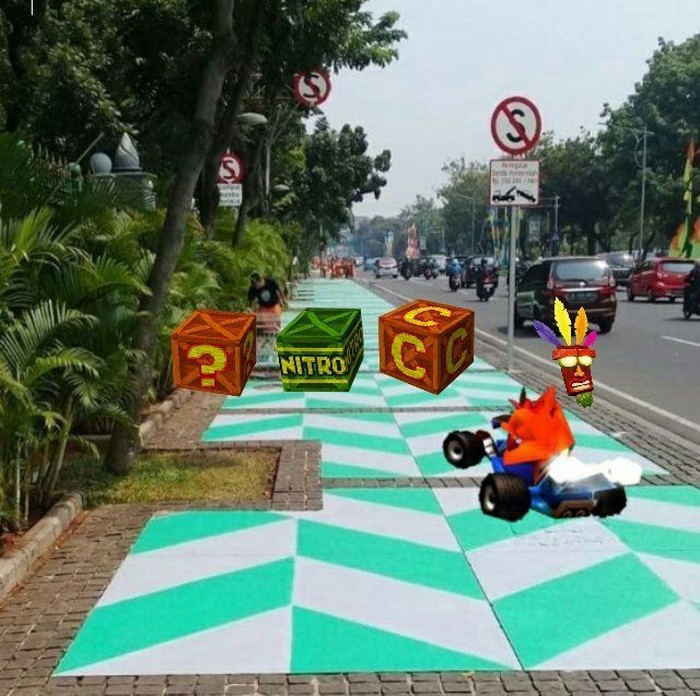 Netizen pun langsung mengedit foto tersebut denganΒ menambahkan karakter Crash Bandicoot di atas trotoar. Foto:Β Twitter/catuaries