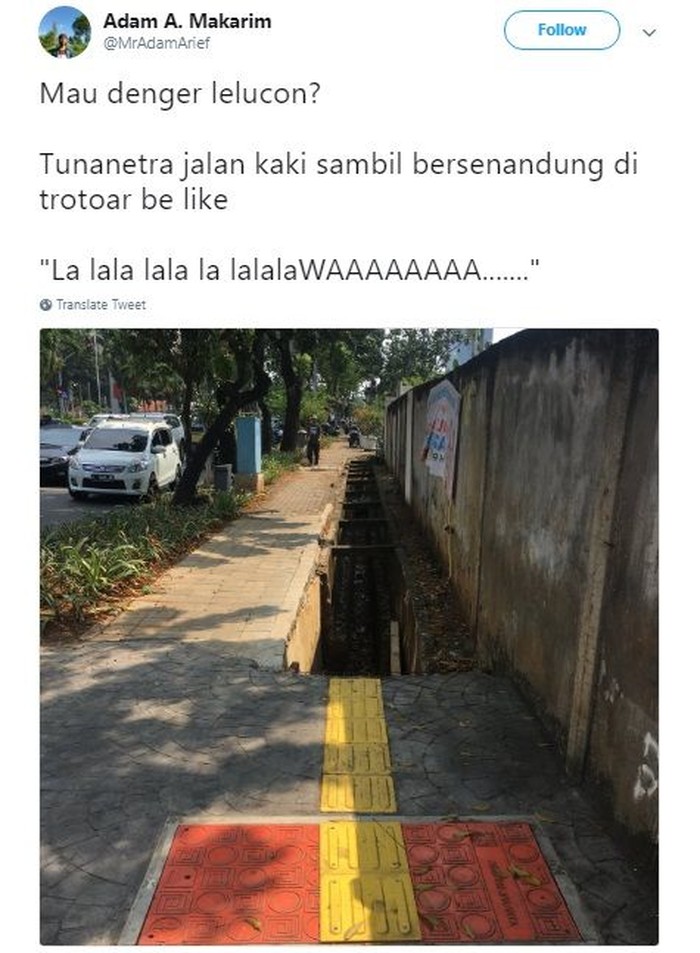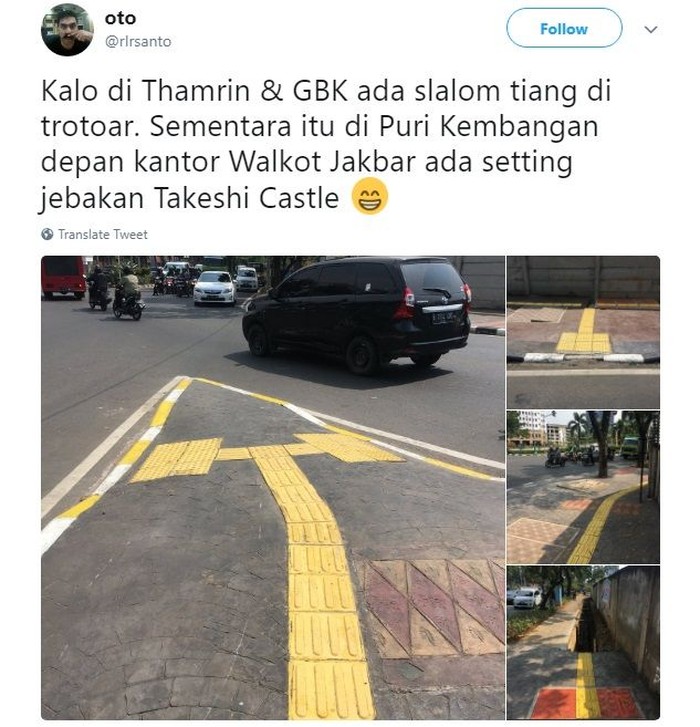 Ada yang bilang guide block di sejumlah trotoar di Jakarta seperti jebakan Takeshi Castle. Foto: Twitter/rlrsanto