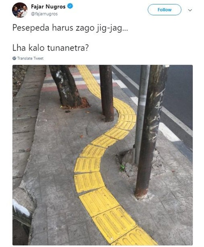 Jika pesepeda masih bisa bergerak zig-zag jika ada tiang, bagaimana yang penyandang tuna netra jika trotoarnya seperti ini? Foto:Β Twitter/fajarnugros