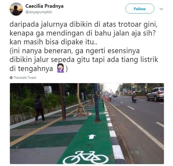 Ada yang bilang harusnya jalur sepeda itu ada di jalan raya, bukan di trotoar. Foto: Twitter/anyapumpkin