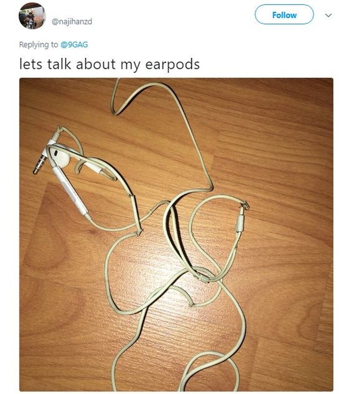 Tak cuma pengisi daya iPhone, kabel earpod pun juga rawan terkoyak. Foto: Twitter