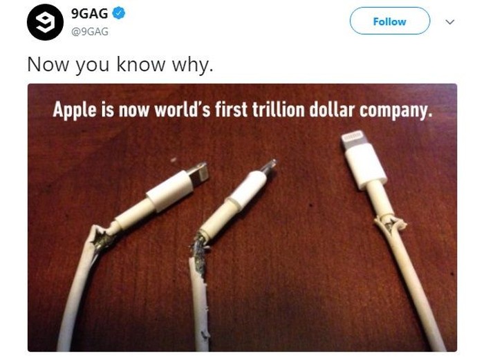 Akun Twitter @9GAG menulis kicauan mengenai 'alasan' di balik kesuksesan Apple dalam menyentuh valuasi USD 1 triliun. Foto: Twitter