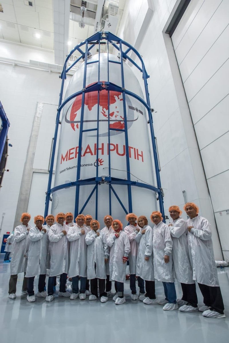 Diterangkan oleh Telkom bahwa satelit Merah Putih sudah siap diluncurkan tanggal 7 Agustus. Roket itu terdiri dari 3 komponen, yaitu step 1, step 2, dan fairing, yang saat ini semuanya sudah utuh dalam satu kesatuan. Satelitnya sudah berada di dalam roket. Foto: SSL