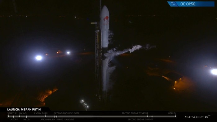 Terdapat logo satelit Merah Putih di fairing, atau penutup bagian atas roket yang membawa muatan. Foto: YouTube/SpaceX