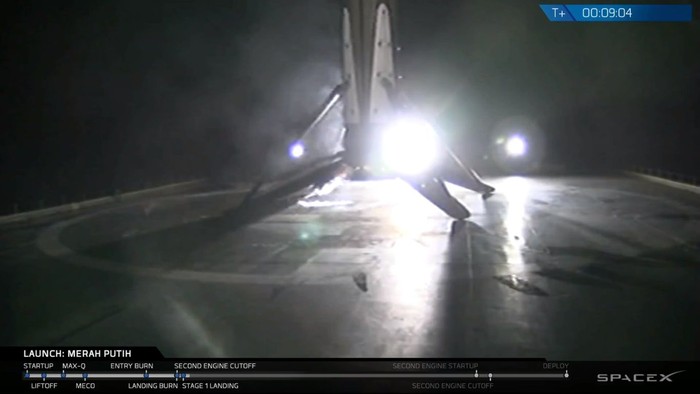 Pendorong roket tersebut berhasil mendarat di droneship bernama Of Course I Still Love You. Foto: Istimewa