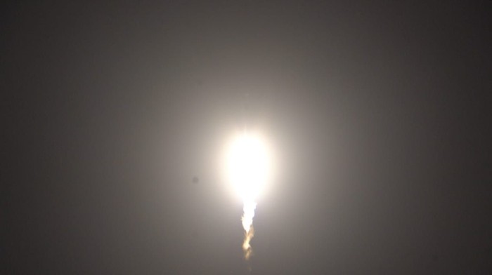 Dari tempat peluncurannya langsung, tampak cahaya dan asap roket berwarna lebih terang. Foto: Iswahyudi