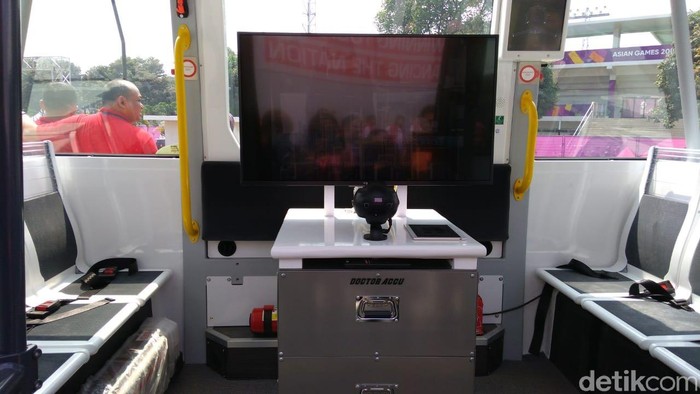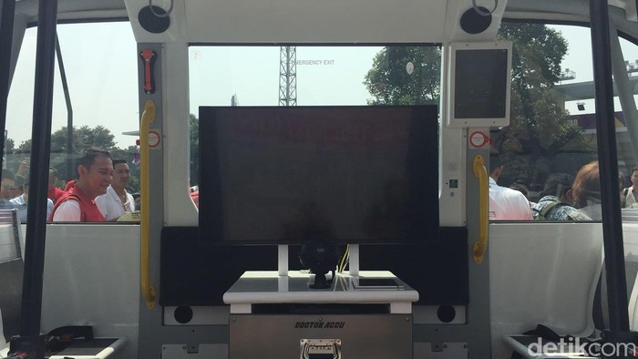 Selain itu, tepat di tengah-tengah bus, terlihat monitor ukuran besar yang akan menampilkan video yang ditayangkan oleh Telkomsel. Foto: Agus Tri Haryanto/detikINET
