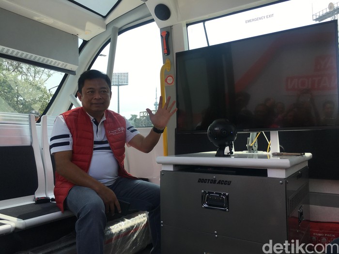 Telkomsel memamerkan bus tanpa sopir di event Asian Games 2018. Foto: Agus Tri Haryanto/detikINET