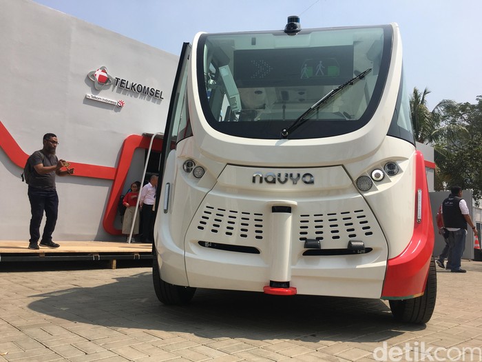 Autonomous Bus adalah teknologi yang perlu dijajal oleh pengunjung. Kendaraan ini akan berjalan tanpa adanya sopir. (Foto: detikINET/Agus Tri Haryanto)
