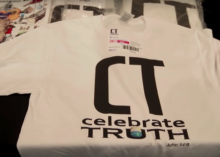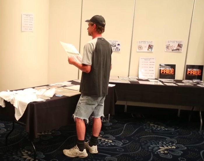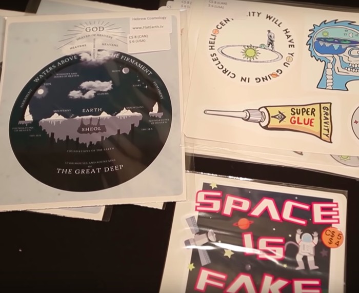 Berbagai macam pernak pernik dijual di arena konferensi termasuk stiker dengan slogan Bumi adalah datar. Foto: Edmonton Journal