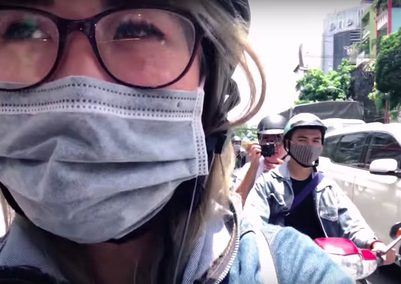 Sang vlogger memakai masker yang disediakan driver Go-Viet. Foto: YouTube