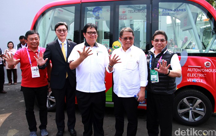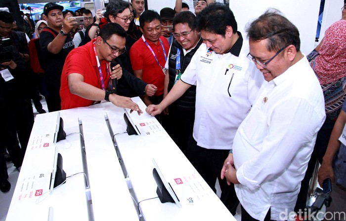 Direktur Utama Ririek Adriansyah, Kim Chang-beom Duta Besar Korea Selatan, Menteri Perindustrian Republik Indonesia Airlangga Hartarto, Menteri Komunikasi dan Informatika Rudiantara, dan Direktur Utama Telkom Indonesia Alex J. Sinaga ketika mencoba Autonomus Electric Vehicle di Telkomsel 5G Experience Center, Jakarta (15/8). Implementasi teknologi 5G akan lebih optimal bila digunakan mesin dalam menghadirkan layanan IoT. Kemajuan teknologi 5G akan memunculkan berbagai macam teknologi revolusioner. Teknologi 5G dapat memperkuat daya saing industri Indonesia di tingkat internasional di berbagai bidang seperti medis, transportasi, dan manufaktur.