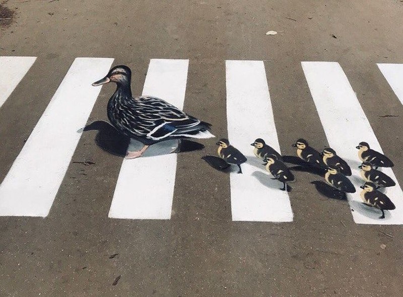 Lukisan 3D keluarga bebek melintas di zebra cross, salah satu upaya kreatif agar pengemudi tidak ngebut-ngebut di jalanan. (Foto: Brightside)