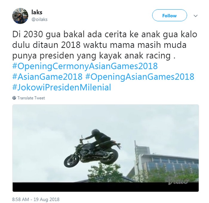 Aksi Presiden Jokowi di pembukaan Asian Games 2018 menarik perhatian. Atraksi moge dan joget dayungnya menuai komentar dan jadi bahan meme yang menghibur.