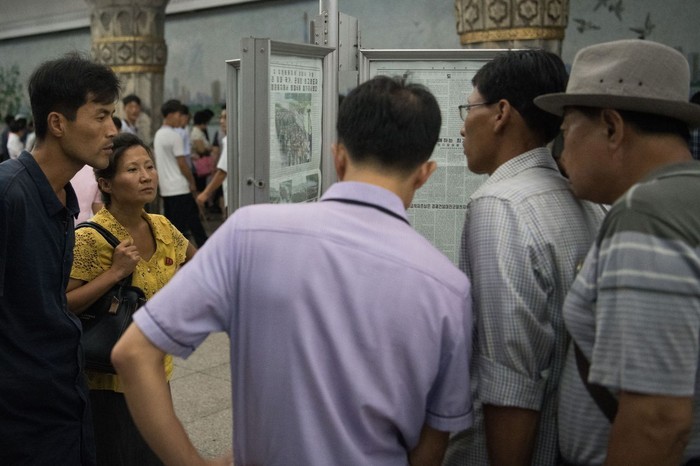 Membaca surat kabar menjadi tradisi di warga Korea Utara. Foto: Carl Court / Getty Images