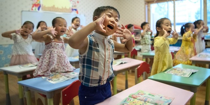 Anak-anak diΒ sekolah yang tengah mengikuti arahan ibu guru. Foto: Carl Court / Getty Images