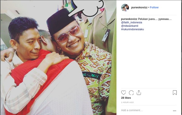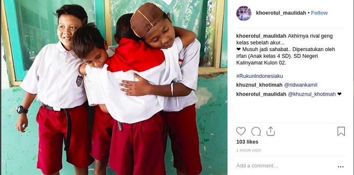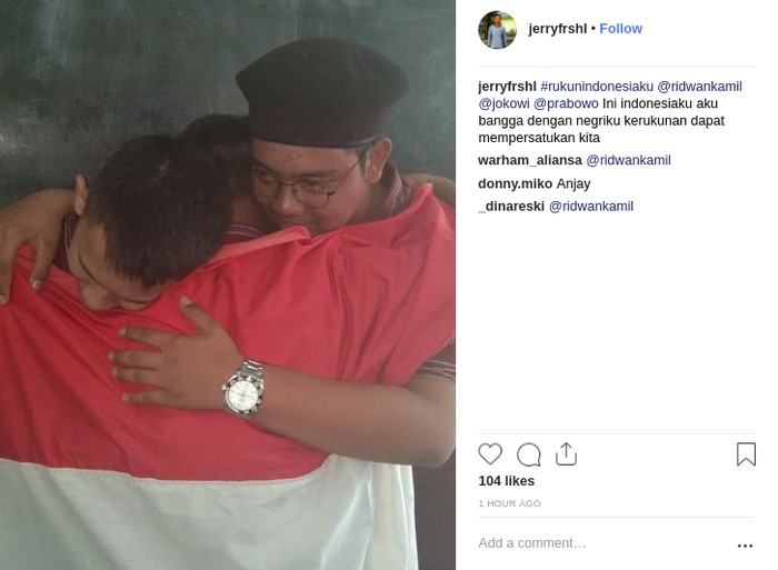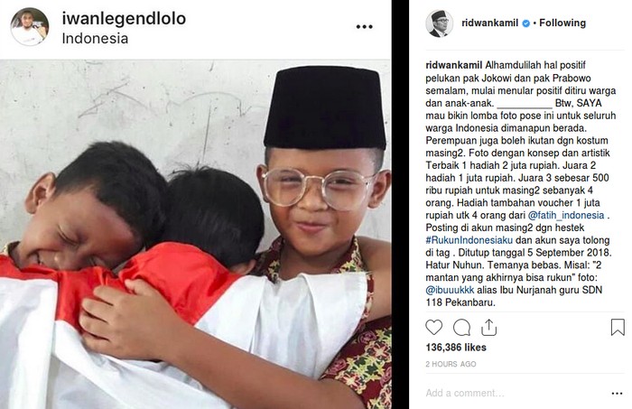 Momen viral dan menyentuh ini pun membuat Gubernur Jabar terpilih Ridwan Kamil ingin semakin menyebarkan aura positif dari momen tersebut dengan membuat lomba foto dengan gaya berpelukan ala Jokowi - Hanifan - Prabowo berpelukan.Β Foto: Instagram @ridwankamil