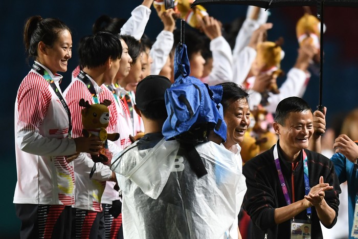 Jack Ma berfoto bersama seluruh anggota timnas sepakbola wanita China. Foto: Alisports
